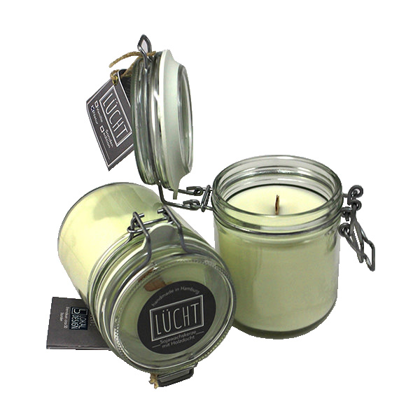 Unser Lücht kommt im widerstandsfähigem Einmachglas, ganz schlicht und unverblümt mit großmütterlichem Charme. Ein weißer Gummiring dient zur Dichtung. Der doppelte Holzdocht knistert leise beim Verbrennen, was die Kerzenlicht-Atmosphäre noch unterstreicht.