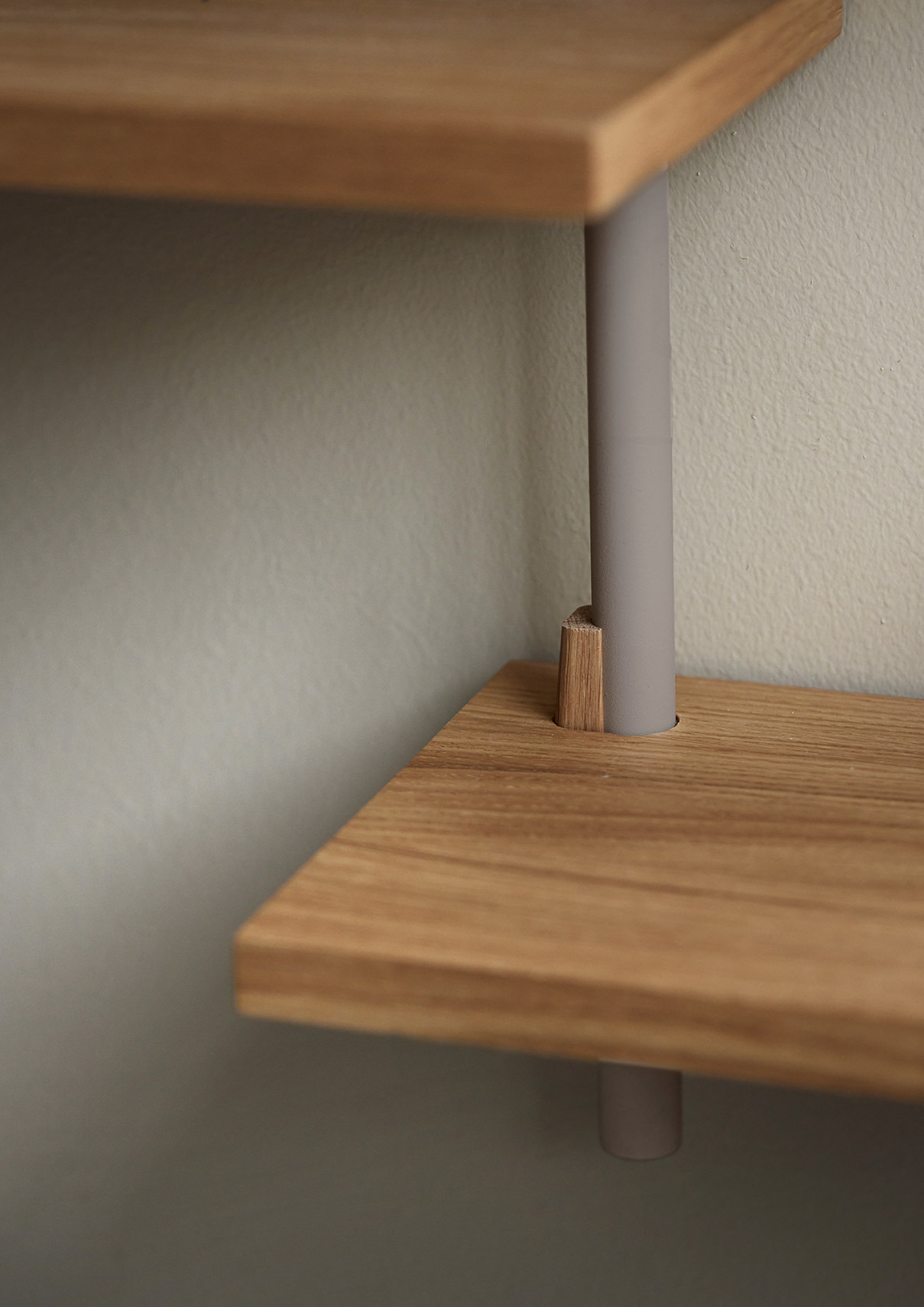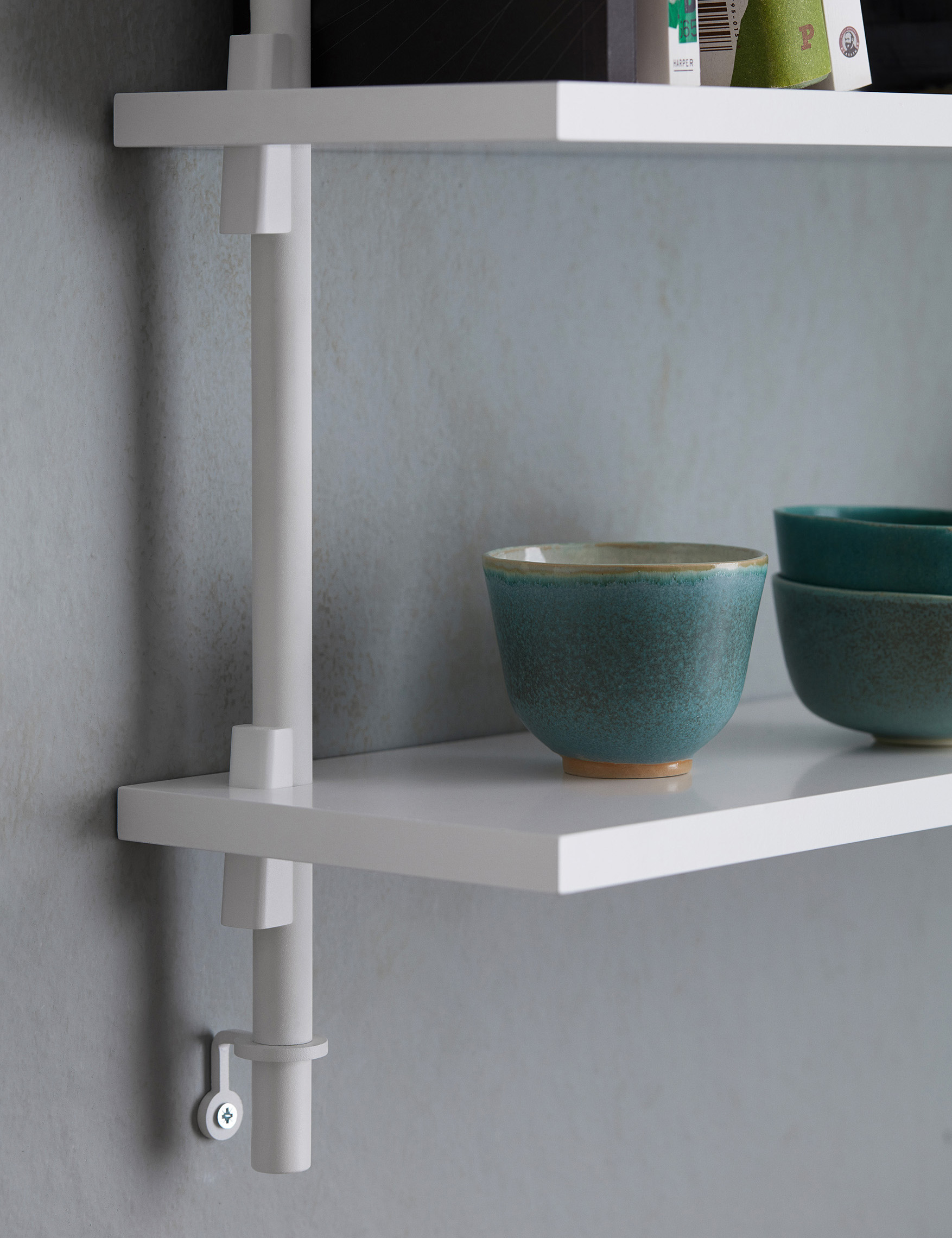 Das Wall Shelving wird an der Wand befestigt: jeweils am unteren und oberen Ende und zusätzlich an jedem neuen Beinstück.