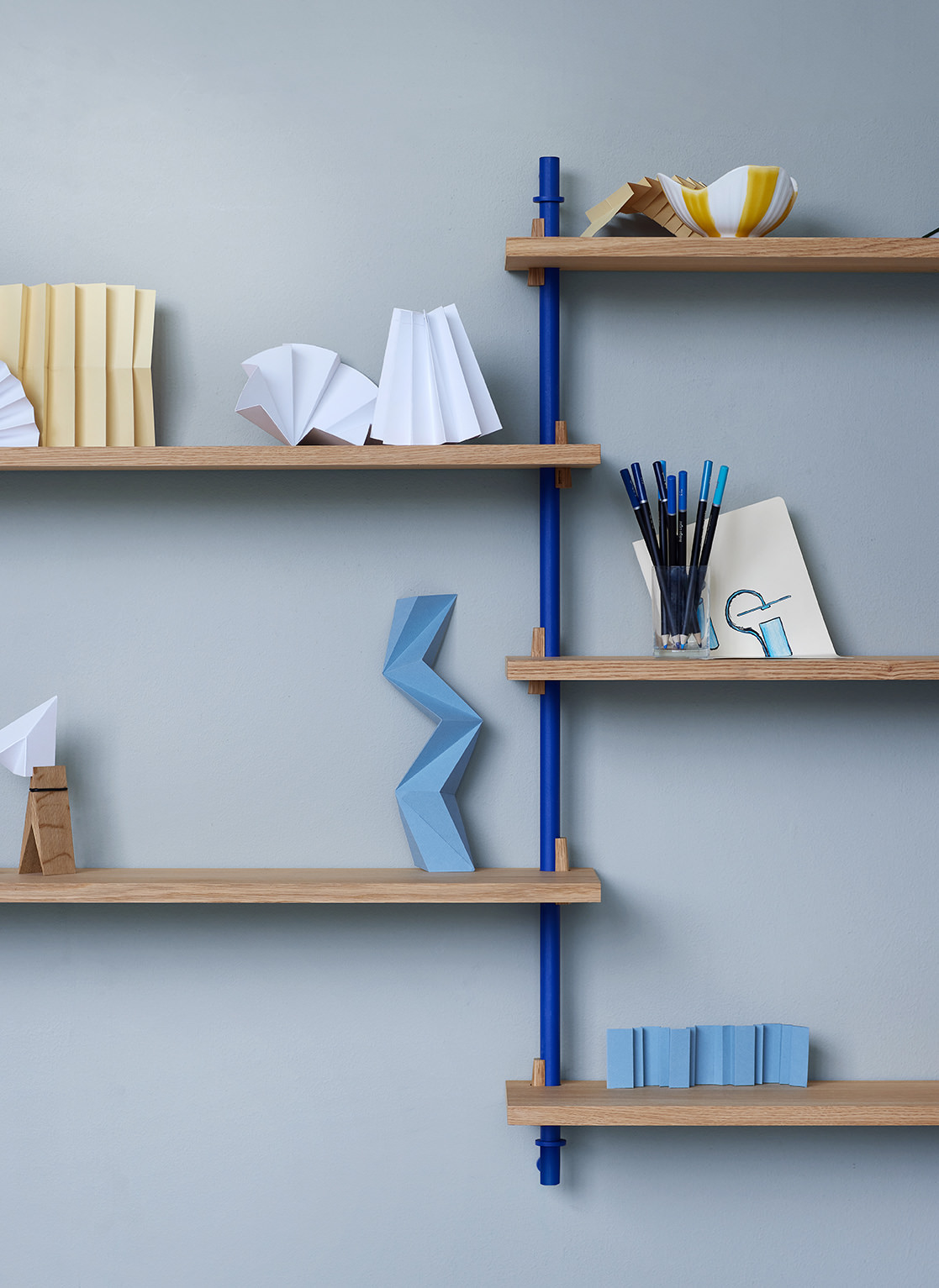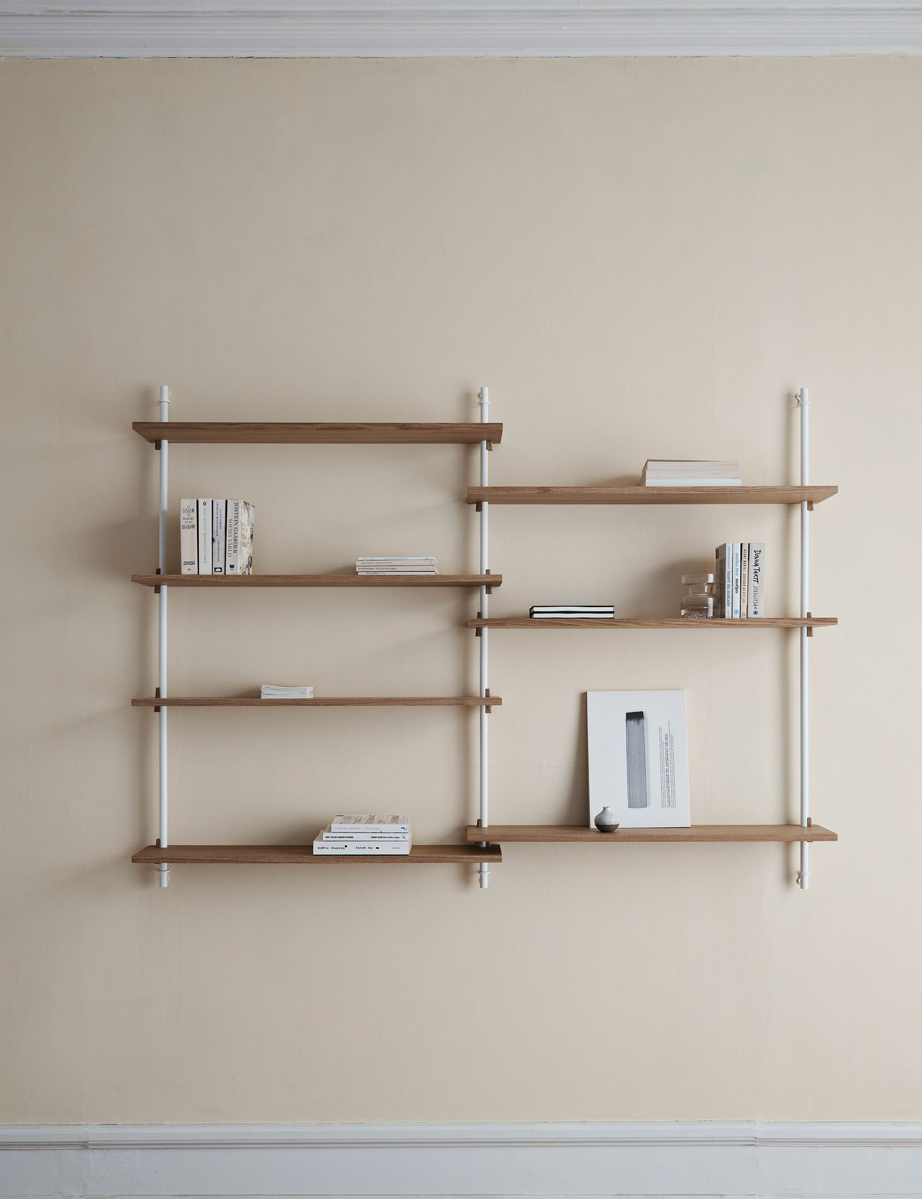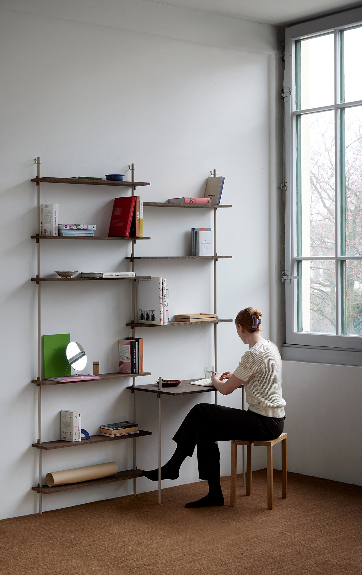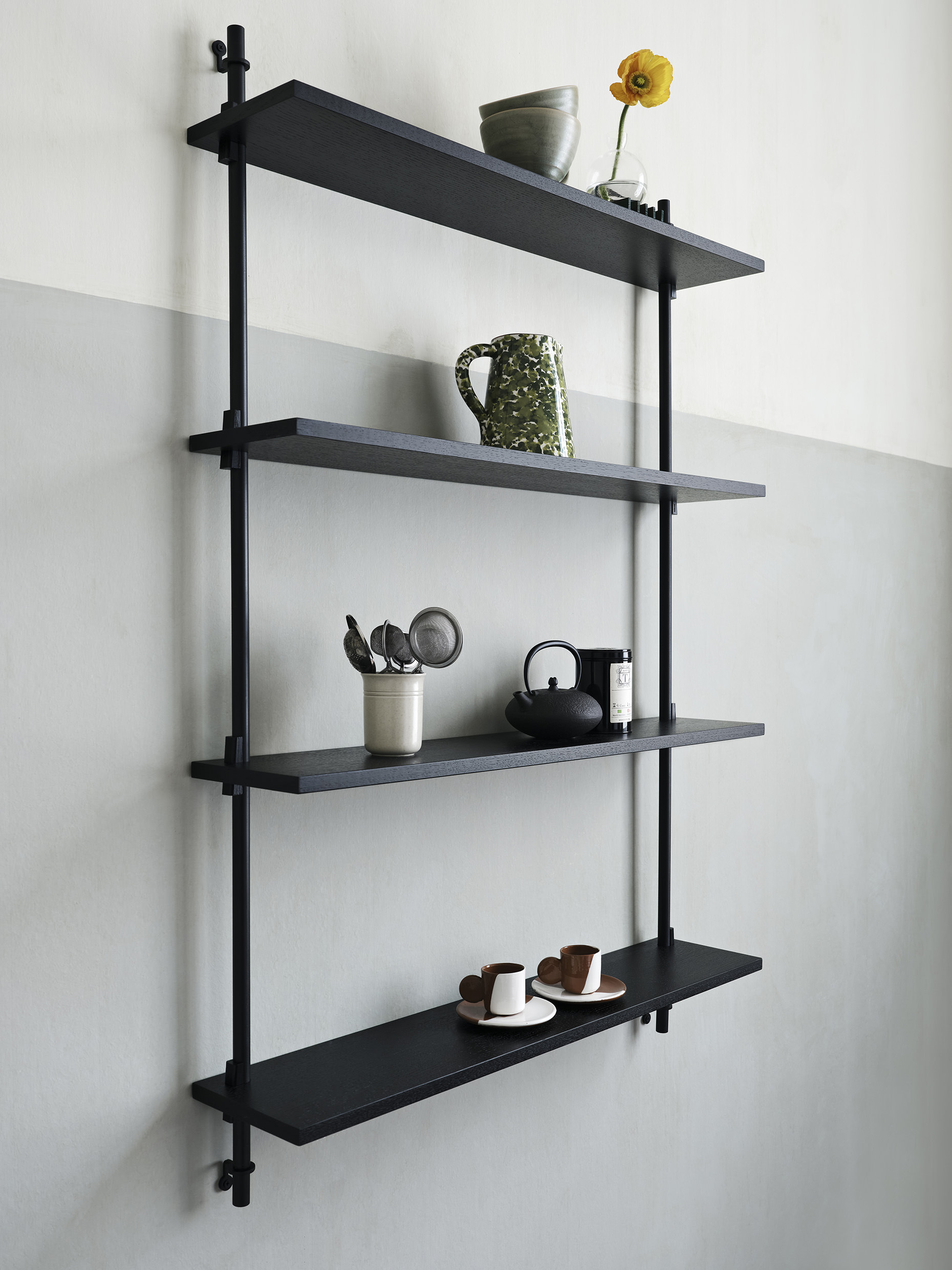 Das Wall Shelving besteht aus individuellen Einzelteilen. Es kann immer wieder auseinander gebaut und neu zusammen gesetzt werden. Du kannst es erweitern – in Breite und Höhe – und die Regalböden auf eine andere Höhe setzen. Dir sind keine Grenzen gesetzt.